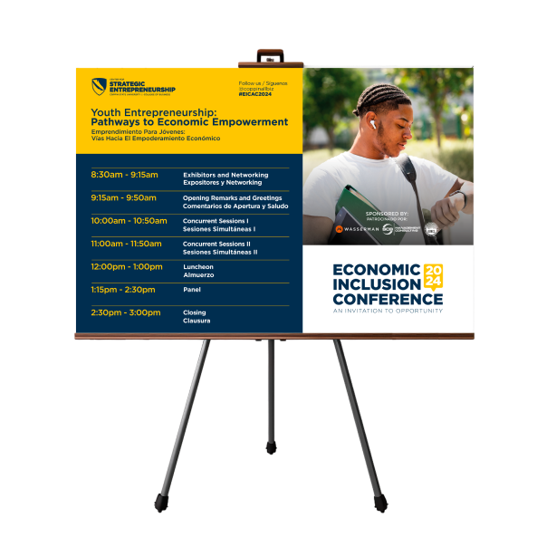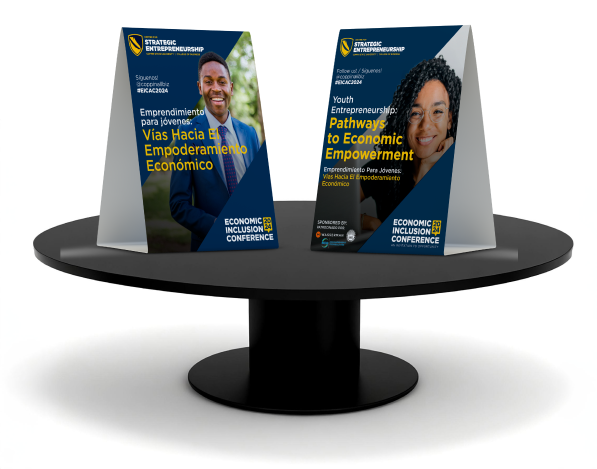 The printed materials showcased a unique and impactful look & feel, seamlessly aligning with the Center for Strategic Entrepreneurship and Coppin State University's visual language. Compelling user imagery, distinctive shapes, and a vibrant color palette created a dynamic experience. To cater to the conference's diverse audience, all printed assets were bilingual, featuring English and Spanish messaging.